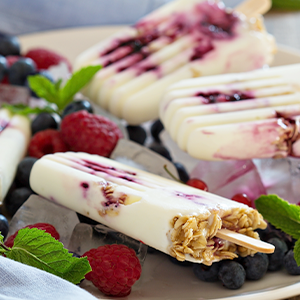 - Vierte la mezcla de yoghurt en los moldes para paleta y añade los frutos rojos al gusto.
